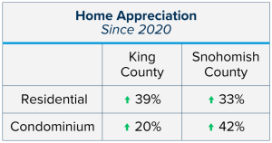 The median price for a single-family residential home in King County has increased by 39% since October 2020 and by 20% for condos. In Snohomish County, the median price for a single-family residential home has increased by 33% since October 2020 and by 42% for condos. This, coupled with higher interest rates, has caused monthly payments to jump up, sidelining some buyers.
