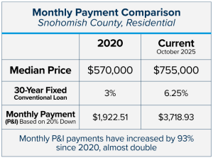 For example, the median home price for a single-family residential home in Snohomish County in October 2020 was $570,000, and the interest rate for a 30-year fixed conventional loan was 3%, equaling a monthly principal and interest (P & I) payment of $1,922.51 based on a 20% down payment. Currently, the median home price in Snohomish County for a single-family residential home in October 2025 was $755,000, and the current rate for a 30-year fixed conventional loan is 6.25%, equaling a monthly P & I payment of $3,718.93 based on a 20% down payment. This comparison illustrates that monthly P & I payments have increased by 93% since 2020, almost double.