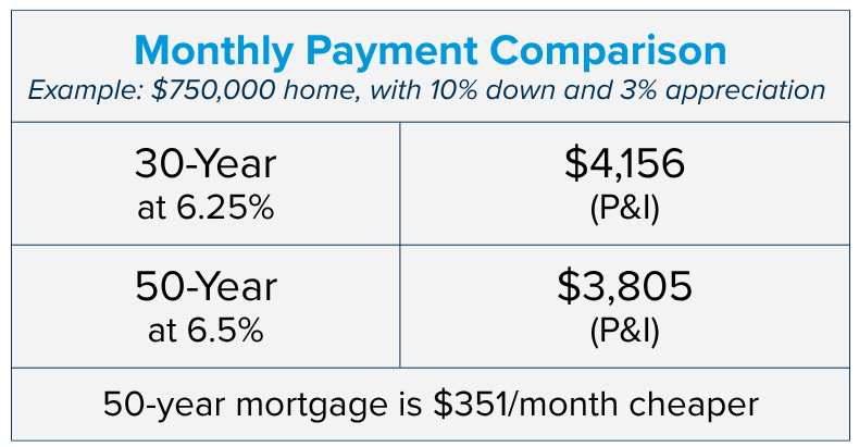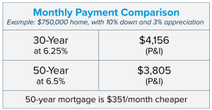 Let’s take a $750,000 home, with a 10% down payment and a conservative annual appreciation rate of 3%. Then apply an interest rate for a 30-year fixed at 6.25% and for a 50-year fixed at 6.5%. It is important to note that a longer mortgage term typically requires a higher interest rate. The 30-year product will result in a monthly P & I payment of $4,156, and the 50-year product will result in a monthly P & I payment of $3,805, a savings of $351 per month.