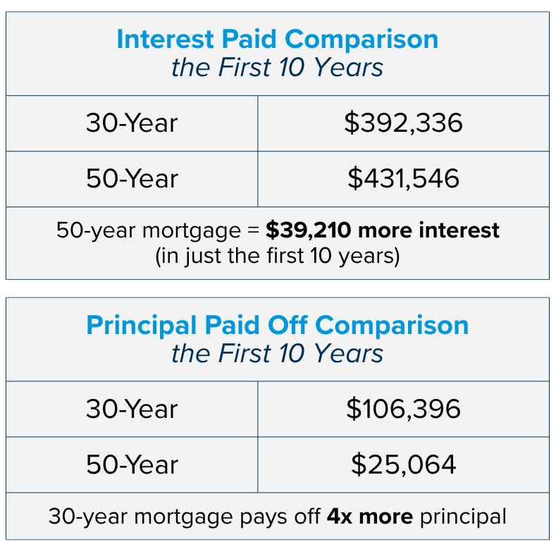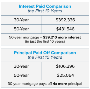 While lowering the monthly payment can be helpful to qualify for a higher loan amount and/or reduce monthly overhead, a borrower needs to consider their wealth-building strategy. In the first 10 years of the loan on a 30-year term, the borrower will pay $392,336 in interest and pay off $106,396 in principal; a total of $498,732 paid. On a 50-year term, the borrower will pay $431,546 in interest and pay off only $25,064 in principal; a total of $456,610.