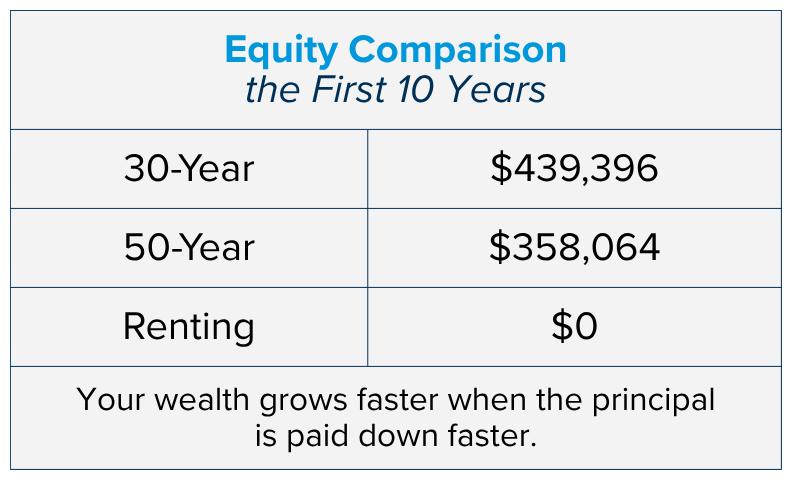 Based on 3% annual price appreciation over those 10 years, the home’s value would be $1,008,000. The 30-year term borrower would have $439,396 in equity, and the 50-year term borrower would have $358,064 in equity, a $81,332 difference. Both options build more wealth vs. renting, which highlights the benefits of homeownership as one of the most powerful wealth building tools.