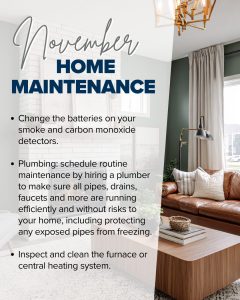 Prevent health and safety risks during cold months by updating the life-saving devices in your home with fresh batteries, evaluating the efficiency of your central heating system and ensuring your plumbing is prepared for potential freezes as well as clear of blockages or leaks.